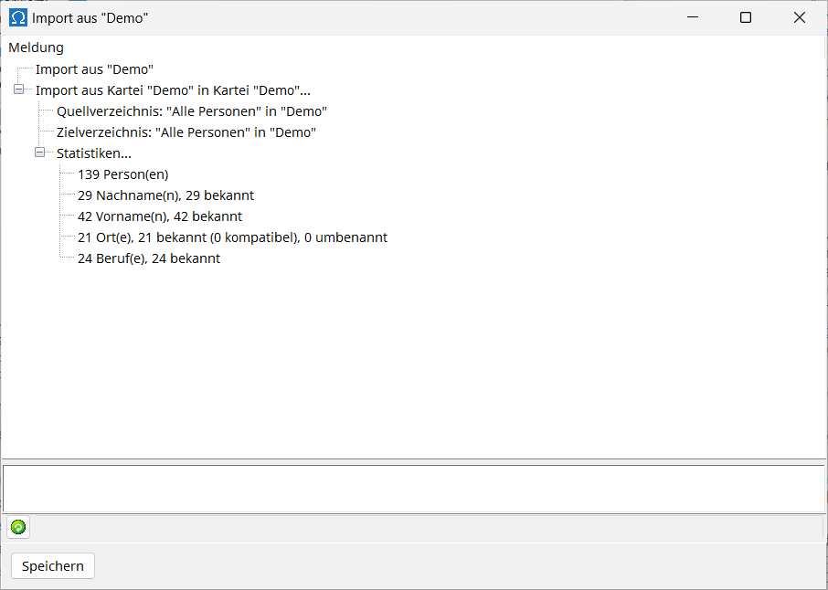 Lors du processus d'importation, en plus des personnes importées, leurs noms de famille, prénoms, lieux et professions sont nouvellement créés dans le fichier cible, à condition qu'ils n'y soient pas déjà enregistrés. De plus, les liens avec les parents, conjoints et enfants ne sont copiés que si ces personnes sont importées simultanément. Il est donc important de choisir de copier une personne et son père séparément ou ensemble. Si vous les copiez individuellement, le lien père-enfant ne sera pas créé dans l'enregistrement cible. En revanche, si vous les copiez ensemble, le lien père-enfant est conservé.