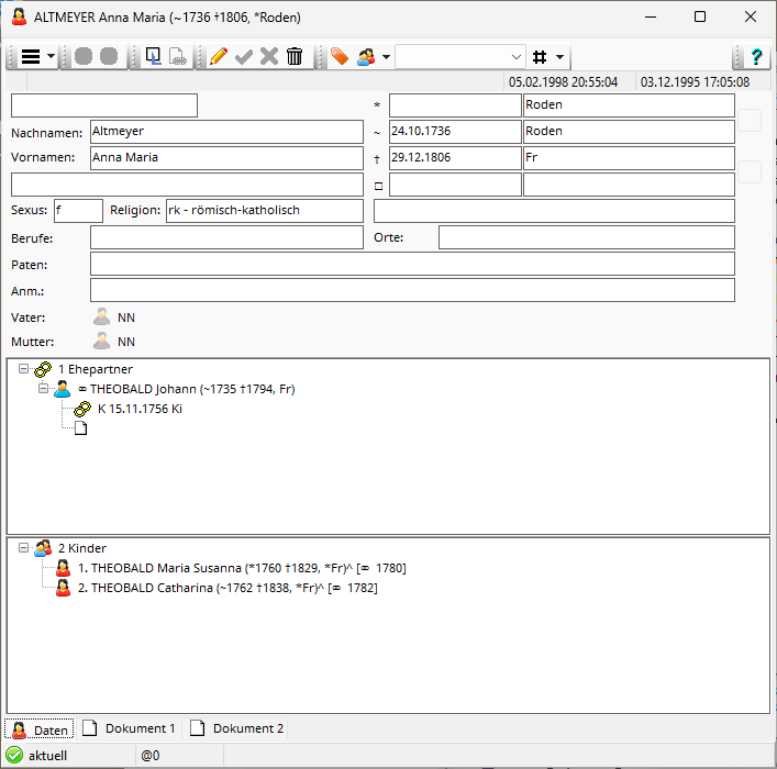 Le champ supérieur présente les données individuelles d' Anna Maria ALTMEYER , le champ du milieu indique le lien avec son mari Johann THEOBALD , et le champ inférieur indique les liens avec ses deux enfants Maria Susanna et Catharina .