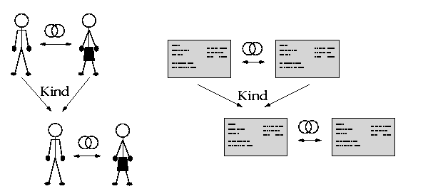 Une personne est intégrée à son environnement familial par la mention de ses parents, de son conjoint et de ses enfants. Le diagramme suivant illustre la différence entre les personnes réelles, avec leurs liens conjugaux et parentaux, d'une part, et les fiches et liens qui représentent ces personnes et leurs relations, d'autre part :