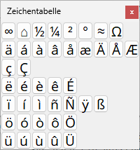 Dans l' éditeur et dans les champs de saisie de texte, vous pouvez accéder à la table des caractères à l'aide du raccourci clavier Ctrl+Y Strg+Y