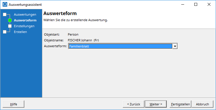 Vous pouvez également sélectionner l'entrée « Fiche de famille » dans le menu contextuel, ce qui générera immédiatement une fiche de famille, sans passer par l'assistant d'évaluation.