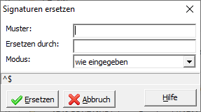 Exemple : Vous utilisez la lettre A suivie d’un chiffre comme signature, par exemple A4711 ou A620 . Pour remplacer la lettre A par Kb dans toutes les signatures de ce type tout en conservant le chiffre, saisissez ^A(\d+)$ comme modèle et remplacez-la par Kb$1 . ^ représente le début et $ la fin de la signature, de sorte que seules les signatures correspondant exactement au modèle A(\d+) seront trouvées. \d+ représente un ou plusieurs chiffres. Les parenthèses définissent un groupe de caractères auquel $1 fait référence lors du remplacement. Pour la signature A4711 , 4711 est référencé à nouveau et ajouté à Kb , ce qui donne Kb4711 .