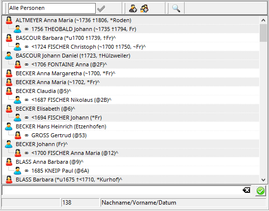 Vous pouvez modifier le nom d'un répertoire créé par l'utilisateur dans le champ de saisie situé dans la barre de menu au-dessus de la liste des personnes. La modification sera prise en compte lorsque vous cliquerez sur la coche verte. Cliquer sur l'icône de personne avec le signe plus au-dessus de la liste permet de créer une nouvelle personne . Cliquer sur l'icône de famille avec le signe plus permet de créer un groupe familial incluant le père et la mère et de les lier en une seule étape.