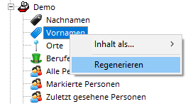 Avant d'ouvrir les répertoires des noms de famille, des prénoms, des lieux, des professions et le répertoire de toutes les personnes, le programme vérifie que le nombre d'entrées dans le répertoire correspond exactement au nombre d'objets correspondants dans la base de données. Dans le cas contraire, le programme propose de régénérer le répertoire. Vous pouvez également régénérer vous-même l'un des répertoires mentionnés ci-dessus à tout moment en sélectionnant l'élément de menu « Régénérer » dans le menu contextuel du répertoire.