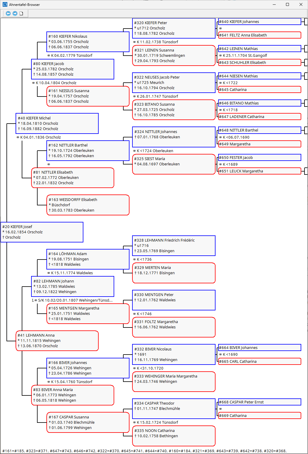 Ouvrez le menu dans la barre de menu de la fiche . Le navigateur généalogique vous permet de parcourir l'arbre généalogique de la personne affichée.Un arbre généalogique s'affiche, indiquant la personne actuellement sélectionnée comme sujet de test sur la fiche d'enregistrement. Cliquer sur l'icône de document en haut ouvre l'arbre généalogique comme une évaluation dans la visionneuse de documents .