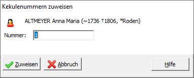 La numérotation Kekulé reflète toujours l'état de la recherche/saisie des données au moment de sa création. Si vous trouvez et saisissez les parents de vos ancêtres les plus anciens, ils ne recevront eux-mêmes un numéro Kekulé que si vous créez une nouvelle entrée de numérotation Kekulé.