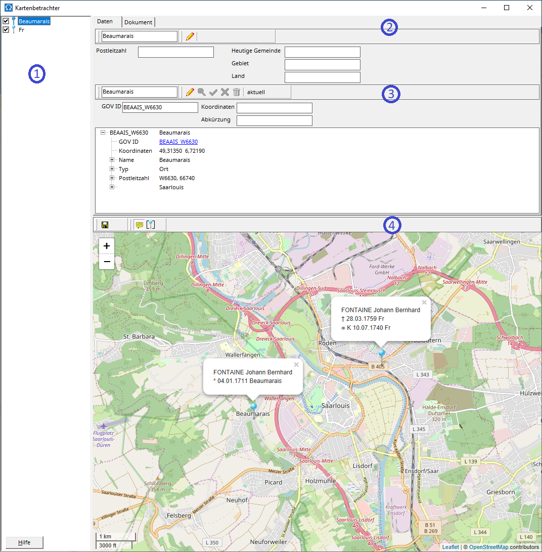 La carte affiche tous les lieux de la liste pour lesquels des coordonnées sont disponibles. Il est possible d'exclure certains lieux de la vue cartographique (4) en décochant la case correspondante.