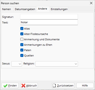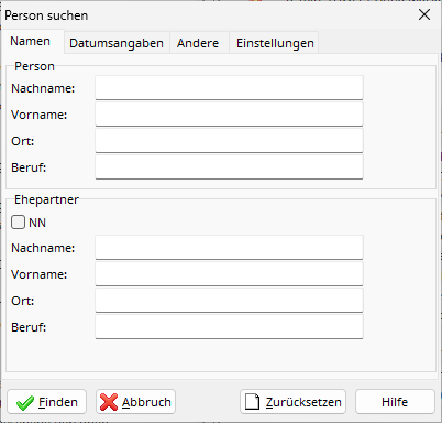 Il est possible de saisir plusieurs mots dans un même champ (par exemple, « Anna Maria » dans le champ « Prénom ») afin de ne trouver que les personnes dont le prénom correspond à tous les mots. L’ordre n’a pas d’importance (saisir « Anna Maria » dans le champ « Prénom » permettra également de trouver les personnes dont le prénom est « Maria Anna » ).